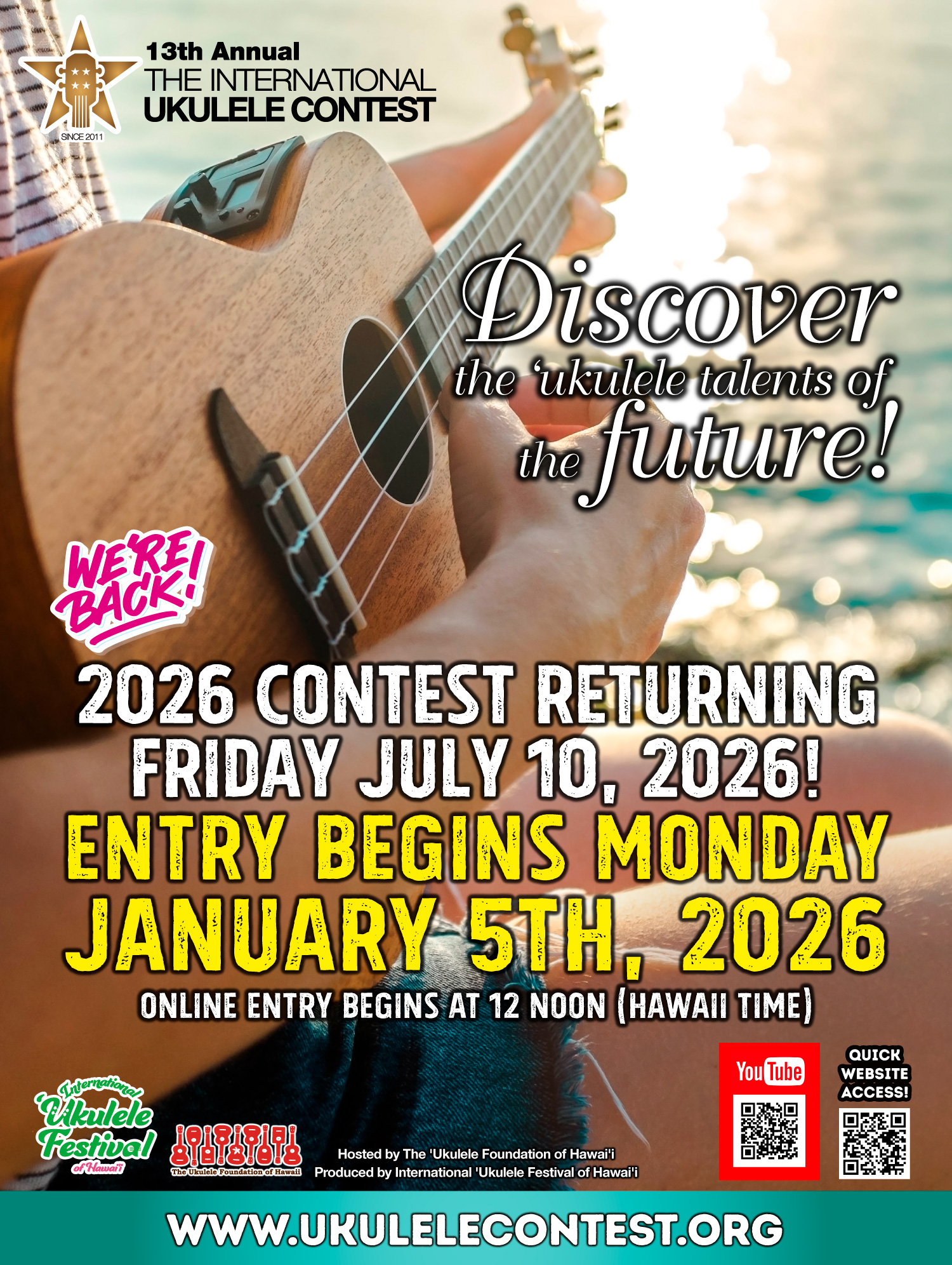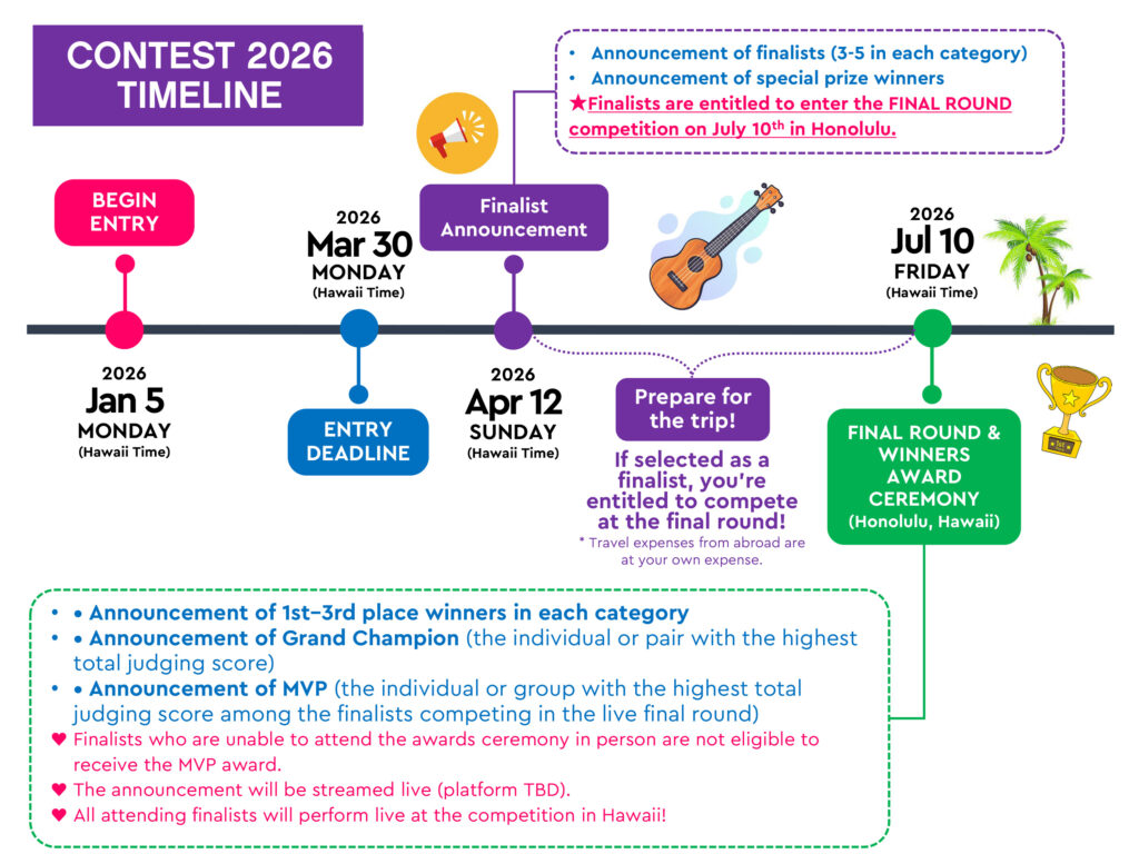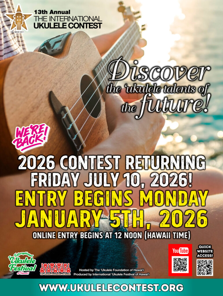 The 3rd International Ukulele Festival of Hawaii is scheduled for July 12, 2026. Two days earlier, on July 10, the 13th International Ukulele Contest Finals and Awards Ceremony will take place in Hawaii. Online preliminary applications for the contest will open on January 5, 2026. (Please refer to the separate document for application details.)