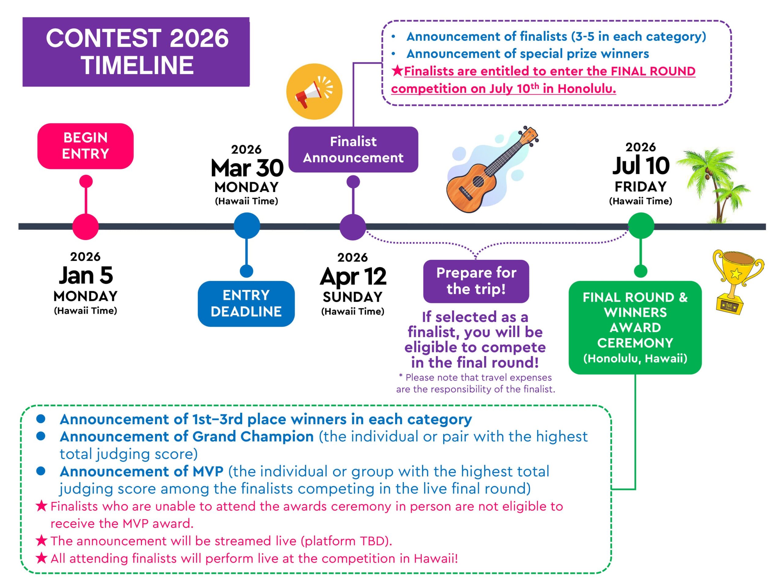 Qualifiers and finalists from each division will be selected and announced on our website on Sunday April 12th, 2026 (Hawaii Time). Finalists are entitled to enter the final round competition in Honolulu, Hawaii on July 10th, 2026 (Hawaii Time).
